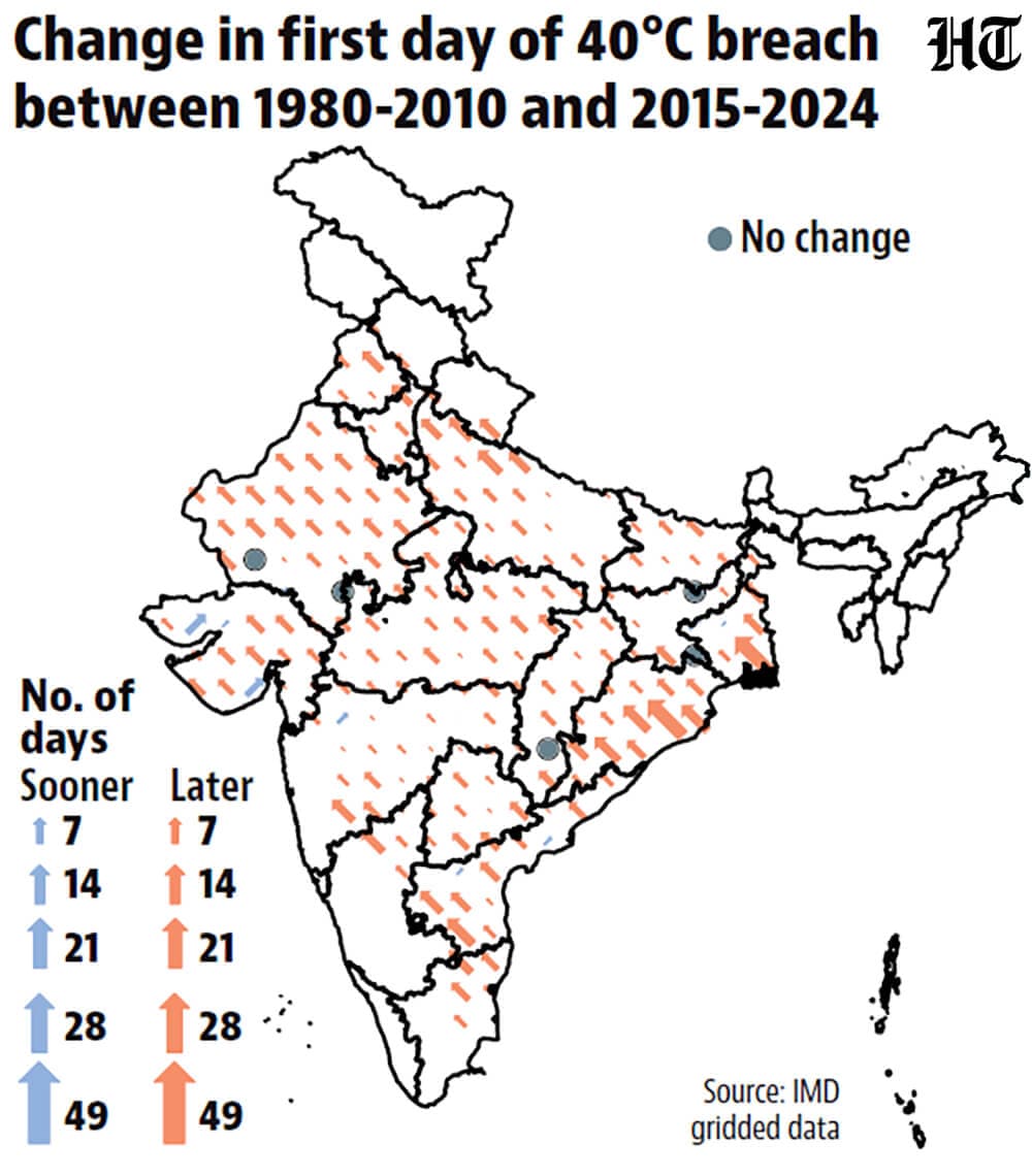 40°C is an important threshold for summer in India. With global warming and deepening climate crisis, what is happening to this threshold on India’s temperature map? An HT analysis of the India Meteorological Department’s (IMD) gridded database shows that the 40°C heat threshold now arrives earlier in most places and lasts longer , although there is no significant change in its geographical spread. Here is a detailed analysis of the data.